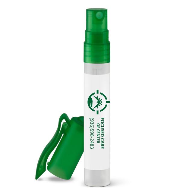 0.33 oz. sprayer, citrus-scented antibacterial hand sanitizer, Made in the USA, exceeds FDA standards, containing 62% alcohol.