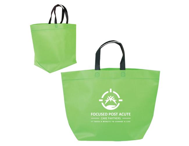 Made of durable and eco friendly heat sealed 80 GSM Non-woven Polypropylene material. Spacious angular tote with large main compartment. Heat-sealed 20"l black handles. Recommended weight tolerance: 22 lbs. 19"W X 13"H X 7"D