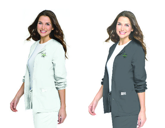 Jewel neckline. Matching snap-ring closures. Two large, top-loading patch pockets. Knit cuff. 65% Polyester/ 35% Cotton Medium length 27 7/8"